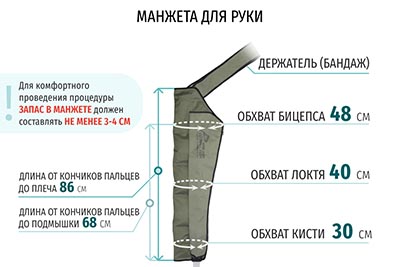Размеры манжеты руки: длина от кончиков пальцев до плеча – 86 см; длина от кончиков пальцев до подмышки – 68 см; обхват бицепса – 48 см; обхват локтя – 40 см; обхват кисти – 30 см.