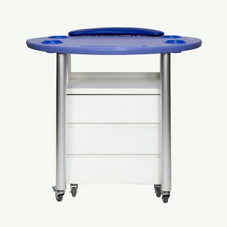 Раздвижной маникюрный стол MD-9007 на колесиках не занимает много места, после процедуры может быть сложен, так же его можно свободно перемещать по кабинету. Столешница и тумба изготовлены из ЛДСП. Две хромированные ноги делают стол устойчивым.